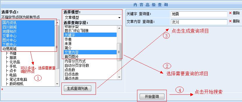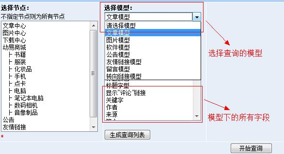 第三步:選擇模型后系統(tǒng)會(huì)自動(dòng)列出該模型下所有的字段,包括自定義字段。選擇我們需要查詢的項(xiàng)目,這里選擇“關(guān)鍵字”和“文章內(nèi)容”進(jìn)行搜索,并填寫好查詢的內(nèi)容。