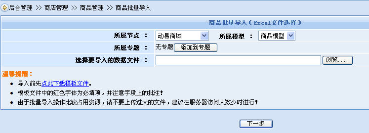 圖1是商品批量導(dǎo)入的操作首頁。我們看到,這里將商品所屬的節(jié)點與模型、專題獨立在商品列表(列表采用Excel文件保存)之外,即每個商品列表將只可一次導(dǎo)入到一個節(jié)點的某一個模型或某個商品專題之中。