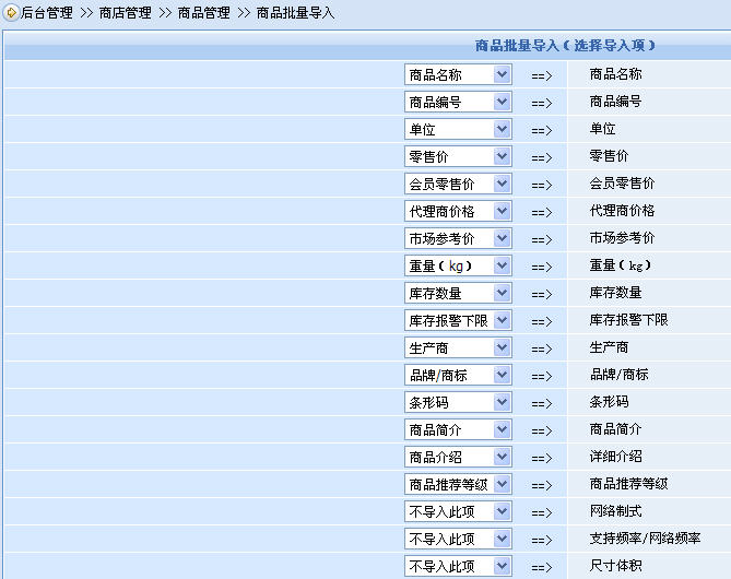 通過圖2,我們看到,excel表格里的的字段會自動對應(yīng)到商品模型的字段去。是的,這里說的是自動,系統(tǒng)根據(jù)字段名稱進(jìn)行匹配而不是根據(jù)位置進(jìn)行匹配(要求字段名稱的文字完全一致)。這意味著,我們可以很輕松地自己設(shè)計excel文件的表格模板。需要注意的是,商品名稱、商品零售價格等幾個字段是必須字段,在自己設(shè)計的excel表格模板里不可缺少,否則將出錯。