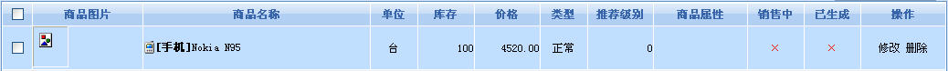 圖3,成功導(dǎo)入商品Nokia N95。我們看到,上圖商品的銷售中、已生成的狀態(tài)為“否”,這是因為在SF eShop 1.1 的批量上傳功能里,我們只允許商家進(jìn)行商品信息添加而不可進(jìn)行商品的銷售管理。要進(jìn)行銷售管理,我們必須回到商品管理中,使用批量管理工具或逐個地管理商品的銷售狀態(tài)。而這個步驟我們就不截圖演示了。