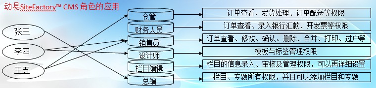 動(dòng)易SiteFactory? CMS的角色是通過標(biāo)準(zhǔn)RBAC(基于角色的訪問控制)模型實(shí)現(xiàn)的,下圖為SiteFactory? CMS中角色應(yīng)用舉例示意圖。我們建立了“倉管”、“財(cái)務(wù)人員”、“銷售員”、“設(shè)計(jì)師”、“欄目編輯”、“總編”等角色,并且它們都具有相對獨(dú)立的控制權(quán)限。將張三、李四、王五賦予不同的角色后,他們就擁有了一系列權(quán)限。從圖中看出用戶與角色是多對多的關(guān)系。即一個(gè)用戶可以屬于多個(gè)角色之中,一個(gè)角色可以包括多個(gè)用戶。