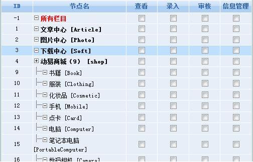 政府、事業(yè)單位、企業(yè)等網(wǎng)站的頻道、專題、欄目都是由節(jié)點(diǎn)來組成,“節(jié)點(diǎn)類權(quán)限”就是對這些頻道、欄目、專題的訪問、錄入、管理等操作的管理權(quán)限。運(yùn)用動易SiteFactory? 可以對網(wǎng)站所有節(jié)點(diǎn)進(jìn)行管理權(quán)限設(shè)置,并可以細(xì)化到每個(gè)節(jié)點(diǎn)的具體操作。如下圖為動易SiteFactory? 默認(rèn)節(jié)點(diǎn)的權(quán)限設(shè)置: