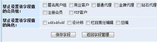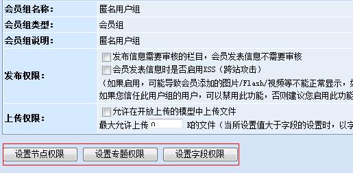 此途徑可以通過(guò)用戶管理中的“角色管理”和“會(huì)員組管理”來(lái)設(shè)置相應(yīng)的字段權(quán)限。先來(lái)看一下動(dòng)易SiteFactory? 新增加的“匿名投稿用戶組”的權(quán)限設(shè)置截圖: