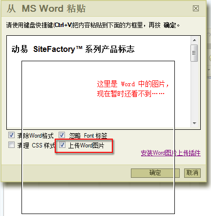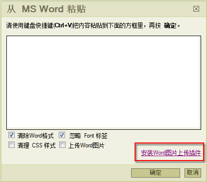三、插件安裝成功后,在“從 MS Word 粘貼”彈出窗口中,將 Word 中的內(nèi)容復制并粘貼(Ctrl+V)到窗口中(當然 Word 中的內(nèi)容應(yīng)該有圖片哩^_^)。要注意勾選窗口中的“上傳 Word 圖片”選項: