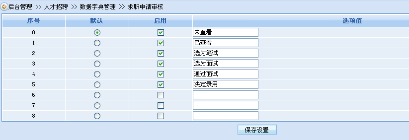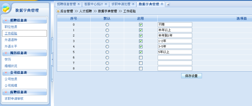 為了用戶可以更好地對系統(tǒng)進行自定義管理,以滿足自己的個性化需求,系統(tǒng)內(nèi)置了數(shù)據(jù)字典管理功能,用戶可以對職位類型、工作經(jīng)驗、職位狀態(tài)、行業(yè)類別、公司規(guī)模等等字段選項進行自定義填寫。