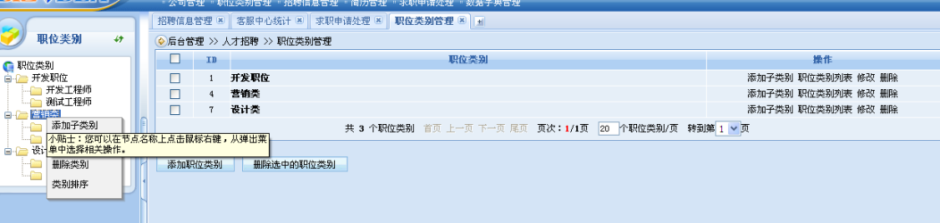 可對所有招聘職位進行良好管理。系統(tǒng)可以自由添加最多二級的不同招聘職位類別,并且可通過直接點擊右鍵的方式來實現(xiàn)便捷添加子類別。