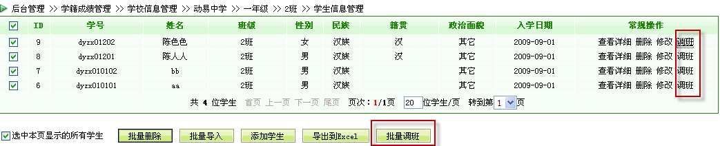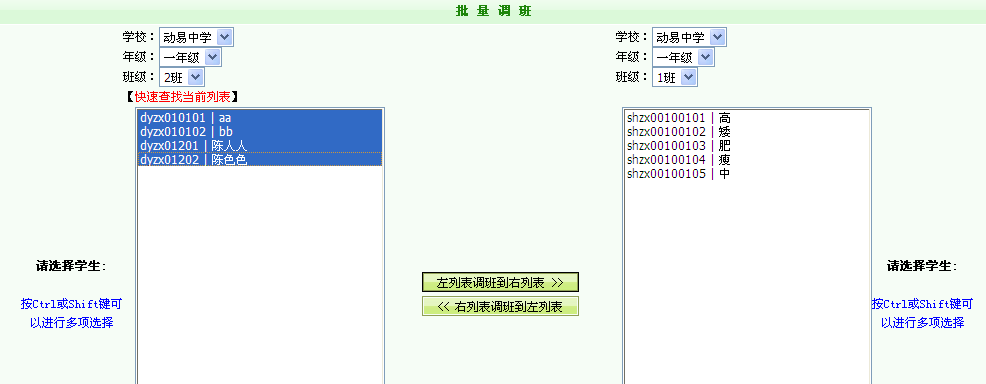 在學校中,學生可能會因為多種情況而需要調班或者轉班,為了切合這一實際需求,3.0學校版新增了給學生調班的功能,可以將學生相關信息從當前班級轉到其他班級。此外,系統(tǒng)還提供了批量調班的功能,可以便捷地實現(xiàn)多個學生的一次性調班操作。