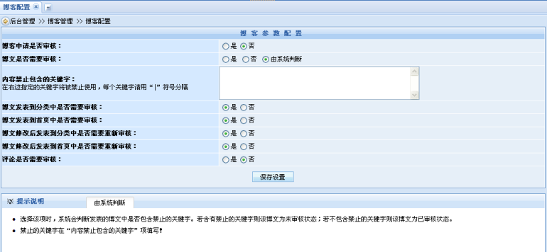 可以對(duì)博客申請(qǐng)和博文/評(píng)論發(fā)布、修改等是否需要審核進(jìn)行自由選擇配置,還可自行添加博文內(nèi)容禁止包含的關(guān)鍵字,以滿足不同網(wǎng)站用戶的個(gè)性化需求。