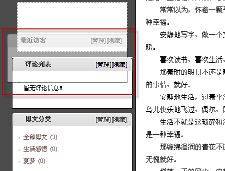 對(duì)于前臺(tái)用戶博客首頁(yè)的功能模塊(最近訪客、評(píng)論列表、博文分類等),可通過(guò)自由拖拽的方式進(jìn)行輕松自由調(diào)整,并且還可一鍵實(shí)現(xiàn)對(duì)每個(gè)模塊的隱藏,充分滿足不同用戶的不同顯示需求。