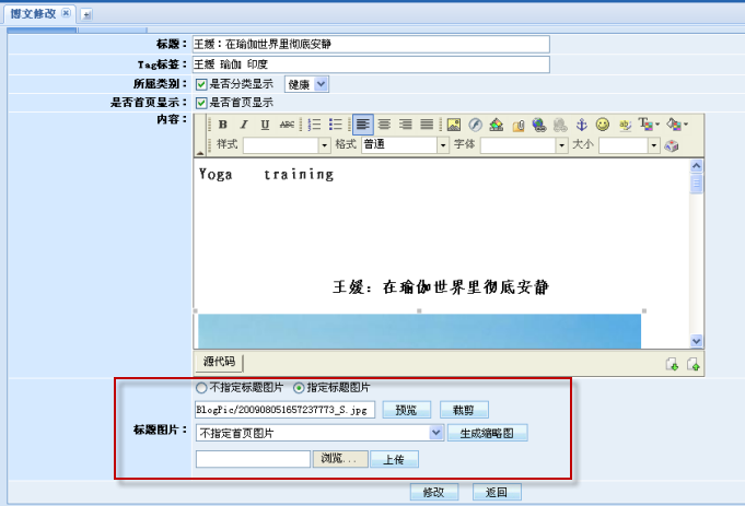 支持圖片博文功能,可將博文中任一圖片指定為標(biāo)題圖片,而且支持對(duì)圖片的在線自由裁剪,以使圖片更好地用于前臺(tái)顯示。