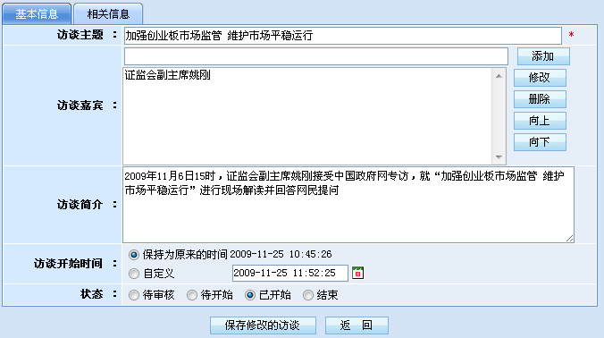 當(dāng)需要?jiǎng)?chuàng)建新一期的在線訪談節(jié)目時(shí),用戶簡(jiǎn)單錄入訪談主題、嘉賓、簡(jiǎn)介、開(kāi)始時(shí)間、摘要、背景資料等信息后,便可快速創(chuàng)建起新的訪談節(jié)目。