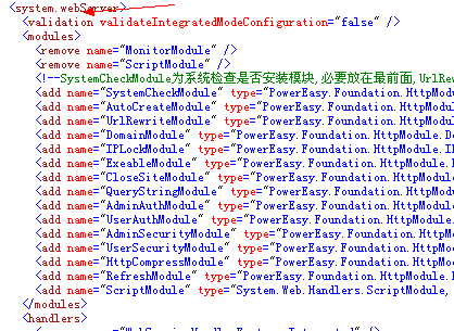 根據(jù)IIS 7的新情況,兼容IIS6等,對(duì)Web.config進(jìn)行了重新配置,主要是對(duì)HTTP Module和Handler 進(jìn)行了重新調(diào)整。