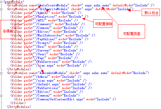 IIS 7 完全整合 .NET 之后,這些 ASP.NET 模塊不只能處理 ASP.NET 網(wǎng)頁程序,也能處理其他如 ASP 程序、PHP 程序或靜態(tài) HTML 網(wǎng)頁,也因?yàn)?ASP.NET 的諸多功能已經(jīng)成為 IIS 7 的一部份,因此 ASP 程序、PHP 程序或靜態(tài) HTML 網(wǎng)頁等類型的要求,也能使用像是Forms認(rèn)證(Forms Authentication)或輸出緩存(Output Cache)等。因此,默認(rèn)情況下HTTP Module需要處理更多沒有必須的工作。如css、jpg、gif、html等某些不需要HTTPModule檢查的請(qǐng)求會(huì)浪費(fèi)系統(tǒng)很多沒有必要的性能。為了解決這個(gè)問題,我們對(duì)HTTPModule模塊化和可配置等改進(jìn)。重新合理調(diào)整HTTPModule的功能模塊,使其各施其職。HTTPModule的可配置化,可以隨時(shí)根據(jù)不同的需求進(jìn)行調(diào)進(jìn)。